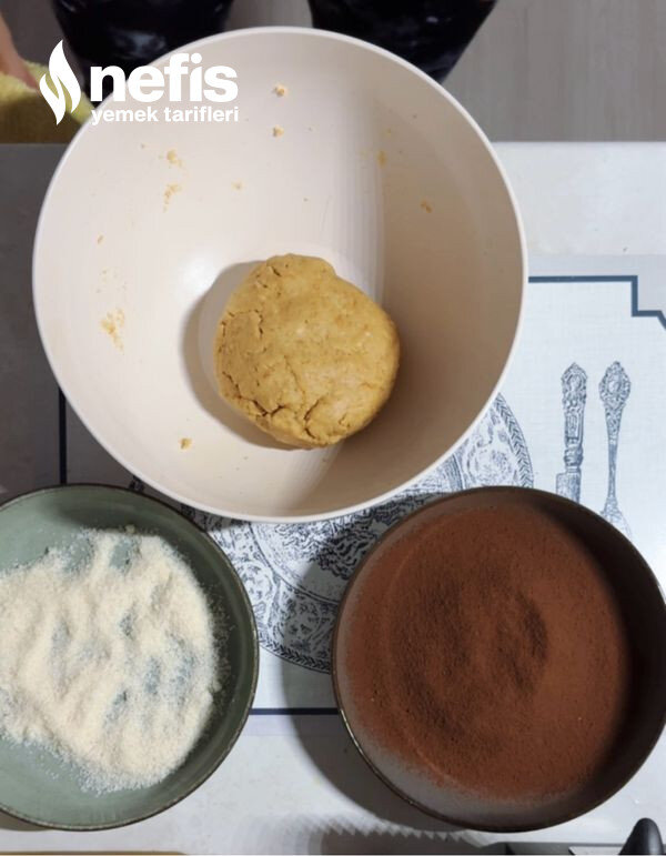 - Yuvarlanan hamurun bir kısmını kakao ile bir kısmını hindistan cevizi ile bulayın.
