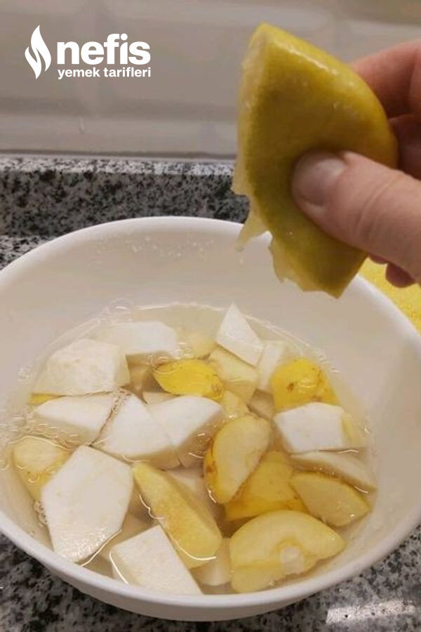 - Ayvaları da doğrayıp limonlu suya atalım.Bunu kararmamaları için yapıyoruz.
