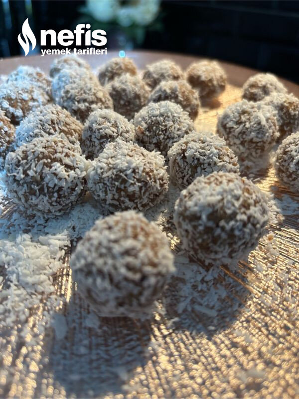 - Tüm materyaller hamur olacak halde karıştırılır ve ufak toplar halinde yuvarlanıp hindistan cevizine bulanır.