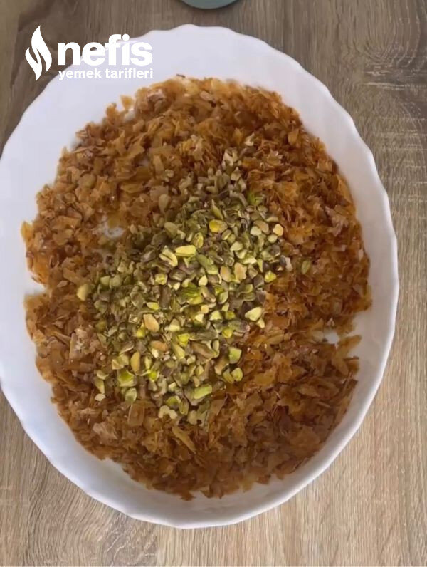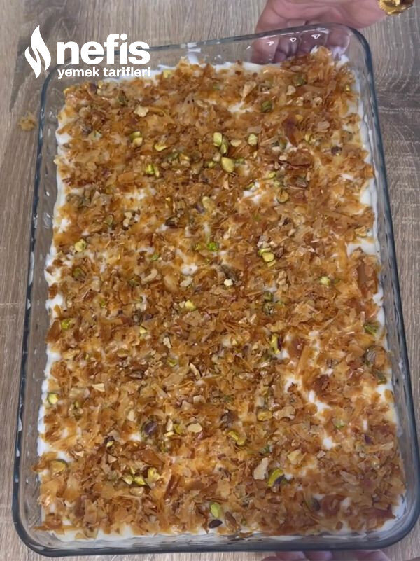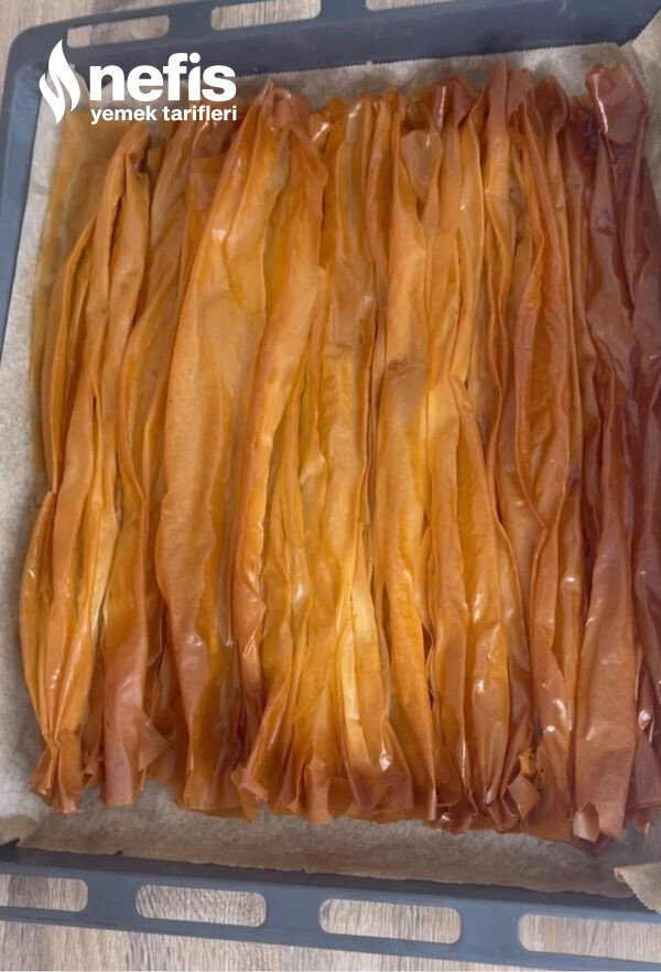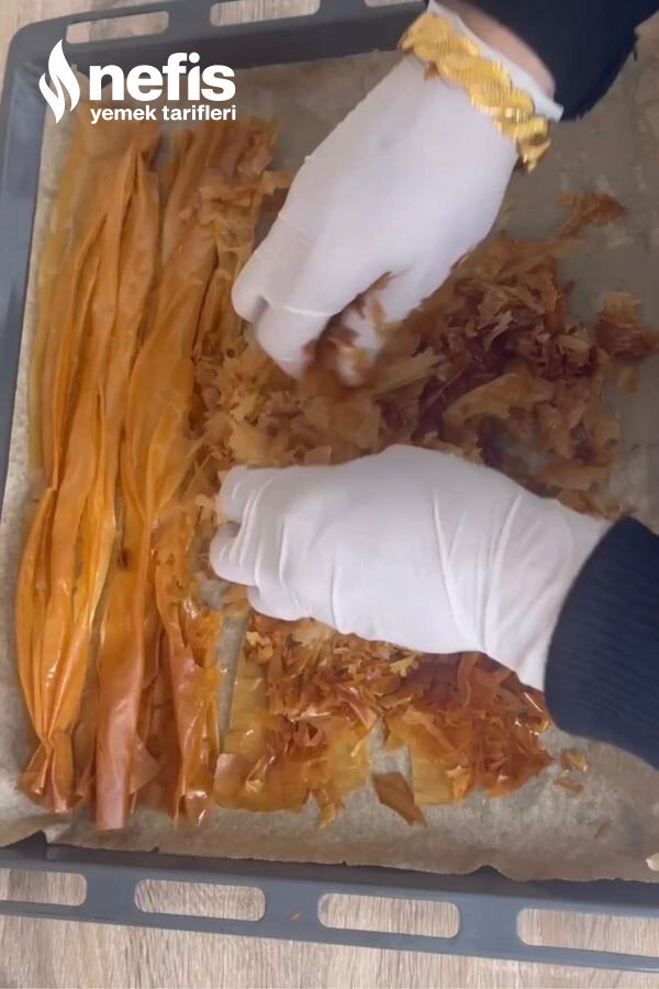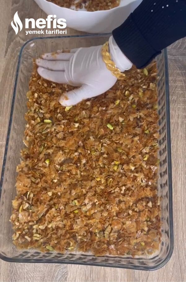 - Pişen yufkaları fırından alın, biraz ılıdıktan sonra elinizle uygunca parçalayın üzerine iri parçalamış olduğunuz ceviz ve antep fıstığı ekleyip karıştırın.