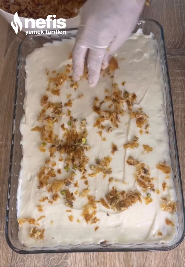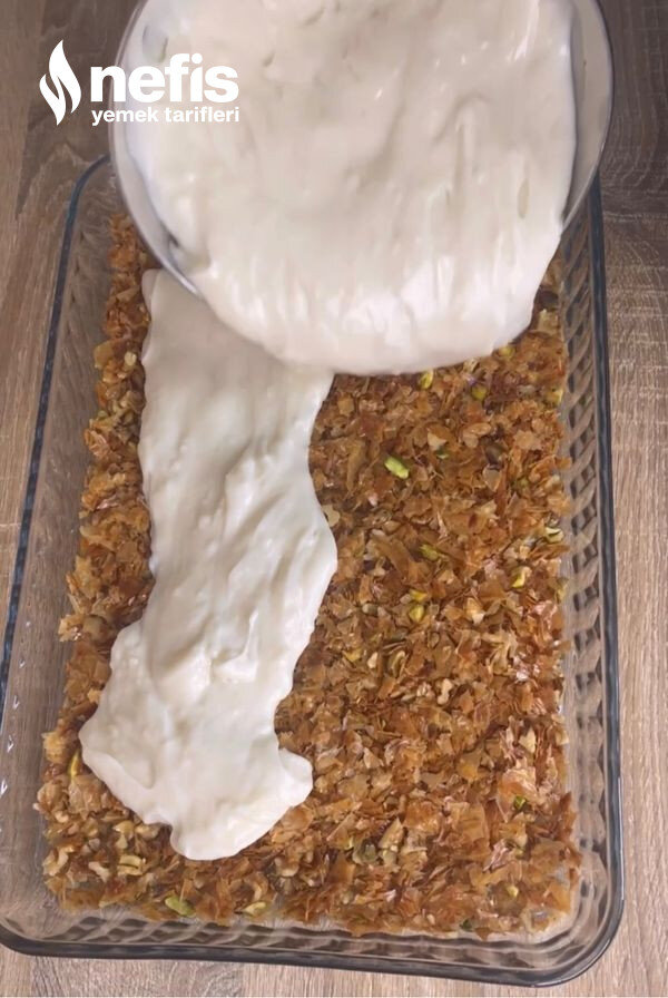 - Üzerine kalan yufka modüllerini dökerek tekrar eşit bir biçimde düzeltin ,soğuması için buzdolabına kaldırın.