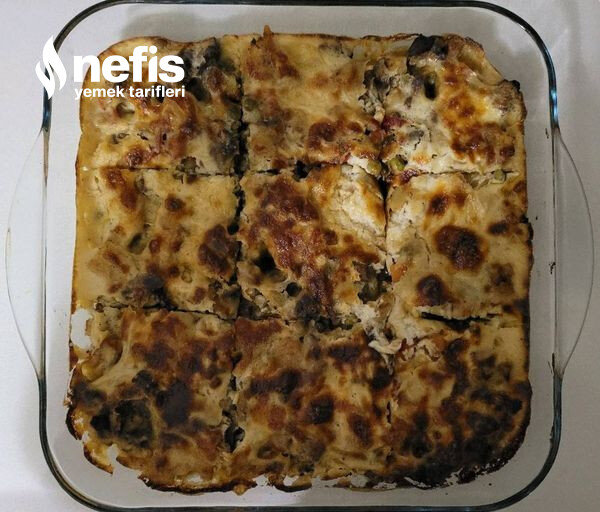- Hazırlanan beşamel sos yemeğin üzerine dökülür. Rendelenmiş kaşar peynir serpilir.