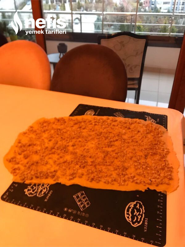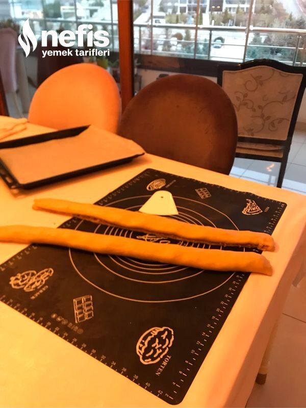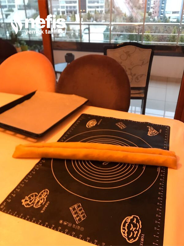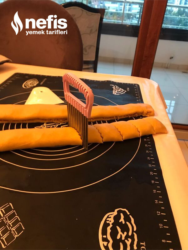 - Hamur her iki tarafından eşit halde rulo halinde sarılır ve ortasından kesilir.