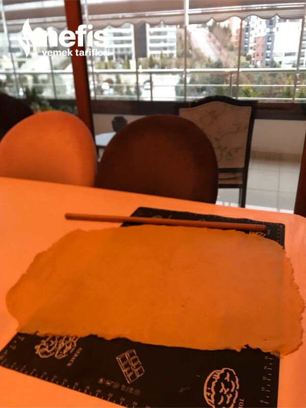 - Dolaptan çıkarılan hamur ince oklava ile yayılarak, dikdörtgen biçiminde güzelce büyütülür.
