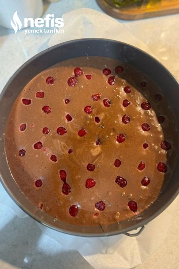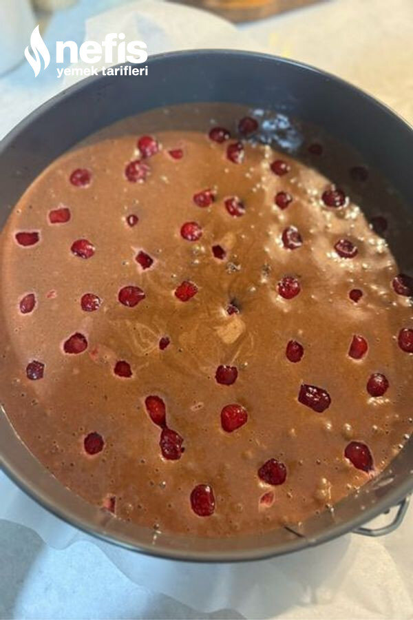 - Son olarak kuru gereçleri eleyerek ekleyip çırpalım yağladığımız fırın kabına karışımı döküp vişneleri ekleyerek 180 derecede evvelden ısıtılmış fırında pişirelim.