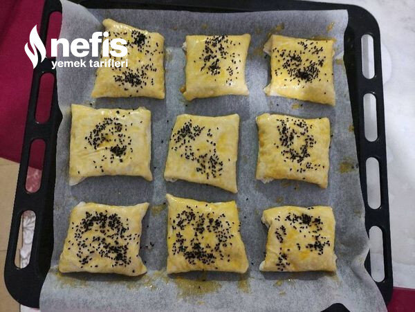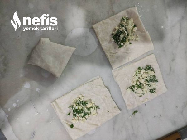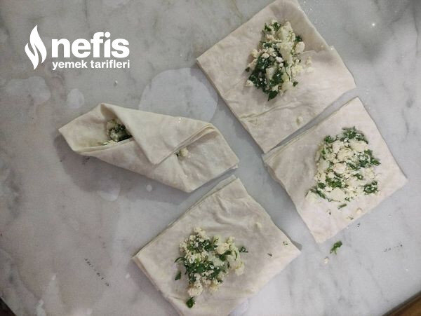 - Kenarlarını zarf üzere katılıyoruz. Uç kısımları aşağıya gelecek formda tepsiye dizelim. Her bir yufkadan dört adet börek elde ediyoruz.