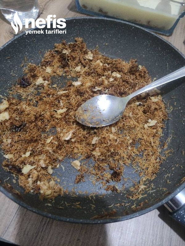 - Öncelikle kıyılmış kadayıfları tavaya alalım üzerine şeker ve yağı ek ederek orta ateşte karıştırarak kavuralım daha sonra iri çekilmiş cevizleri ek edelim, soğuması için kenara alalım.