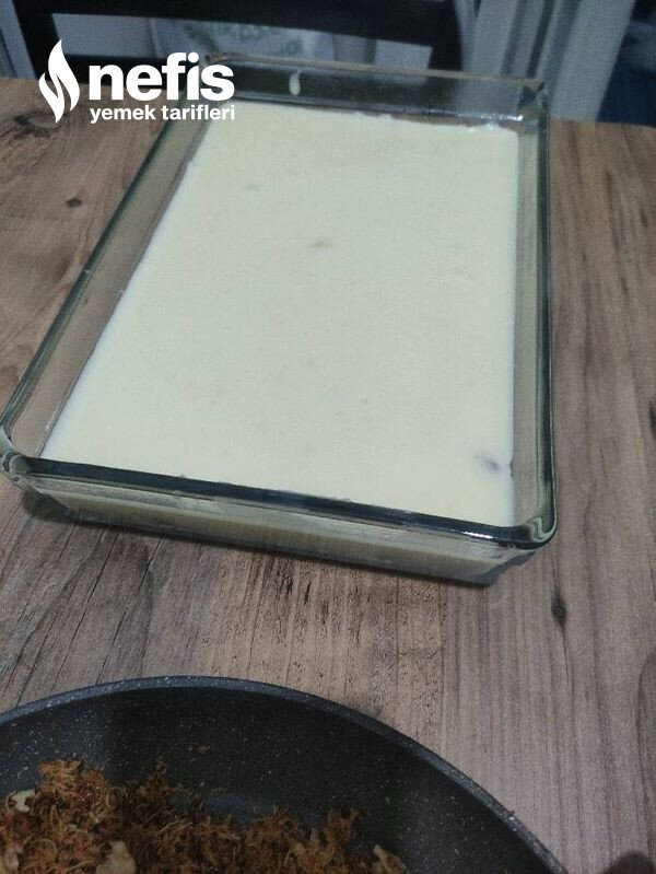 - Tepsinin tabanına kadayıflı karışımın yarısını koyup kepçe yardımıyla muhallebinin hepsini tepsiye dökelim, ılıması için kenara alalım.
