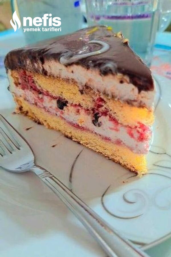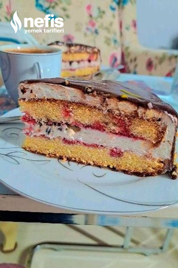 - Ayrıca 1 çay bardağı damla çikolatayı da ekleyip üstüne tekrar vişne suyu ile ıslattığınız pasta tabanının başkasını koyun.
