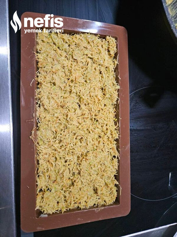 - Daha sonra kadayıf karışımını soğuk çikolata kalıbına (yaklaşık 5 mm kalınlığında) dökün ve tekrar soğumaya bırakın.
