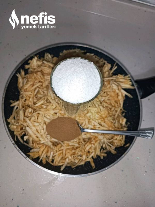 - Kurabiyemize birinci iç harcını yapmakla başlayalım elmaları yıkayıp, güzelce soyup, tavamıza rendeliyoruz ve ocağa alıp elmamızı pişirmeye başlıyoruz.