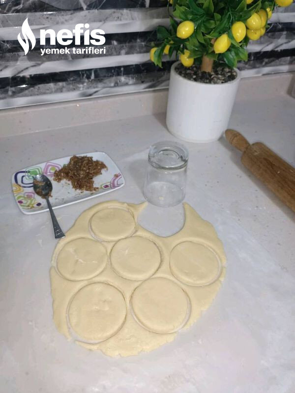 - Hamuru için oda sıcaklığında margarin ve tüm materyalleri ekleyip kulak göğsü kıvamında bir hamur yoğuruyoruz hamuru istediğiniz formda açıp iç harcını ekleyip yağlı kağıt serili fırın tepsimize diziyoruz.