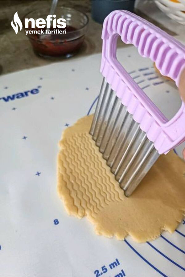 - Hamurdan mandalina büyüklüğünde koparıp merdane ile yaklaşık bir santim kalınlığında açalım ve üzerine patates dilimleyici ile form verip yuvarlak bir kurabiye kalıbı yahut bardakla keselim.