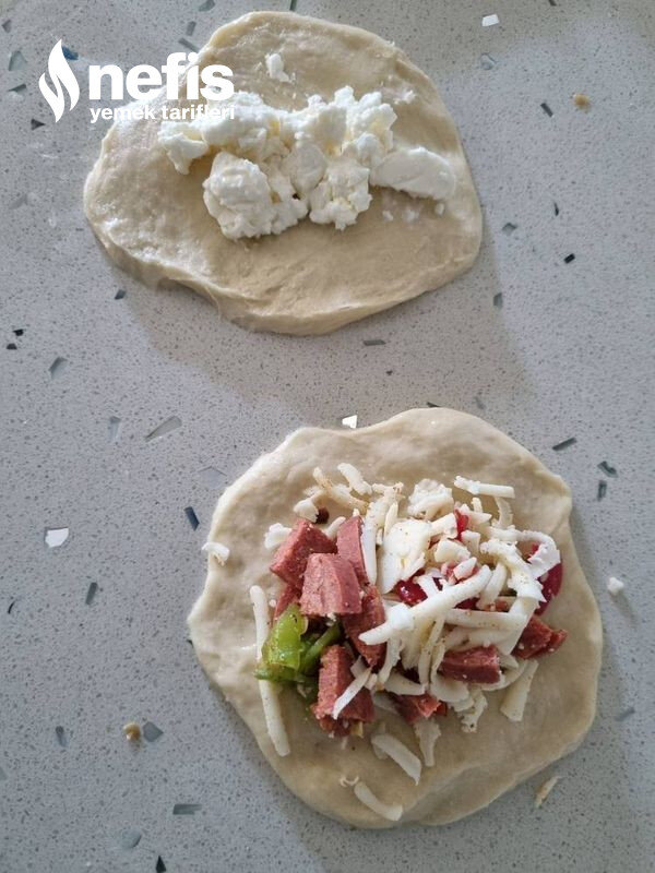 - Hamuru bezelere ayırıp açalım ve hazırladığımız sucuk karışımdan bir kaşık koyup kapatalım ve hamurun öteki yarısınıda peynirli yapalım .