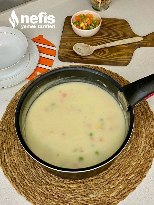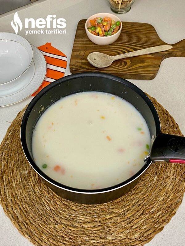 - Süt,garnitür ve karabiber tuzu ekleyip ocağa alıp kaynatıyoruz.