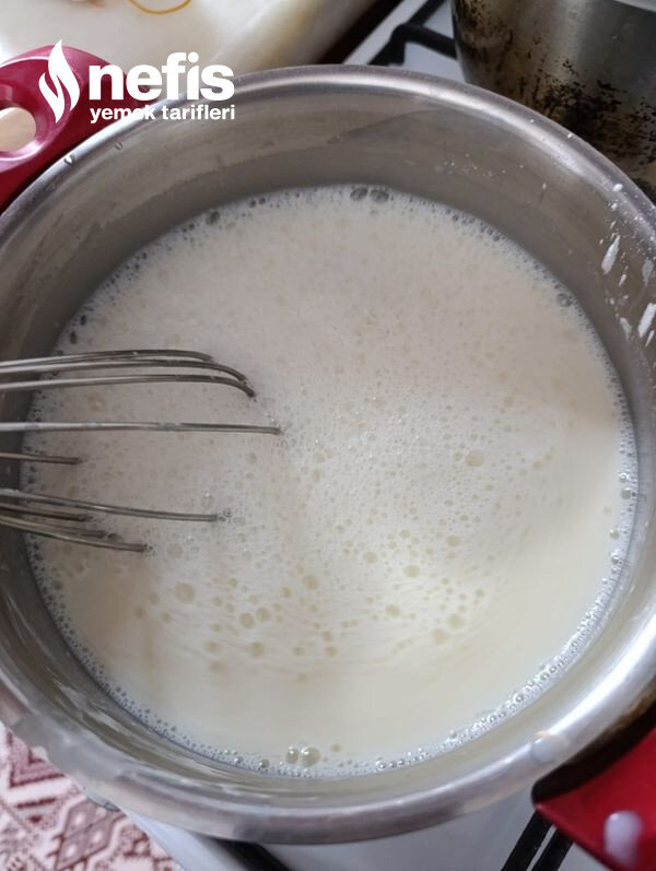 - Daha sonra muhallebisi için süt, toz şeker, un, nişastayı tencereye alalım. Pişirmeye başlayalım.