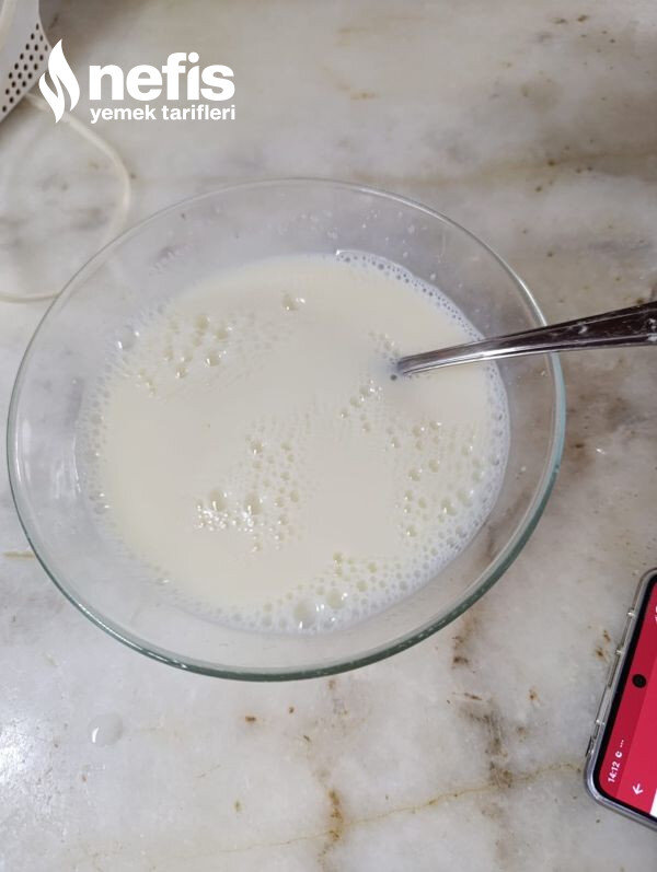 - Keki ıslatmak için uygun bir kapta soğuk süt ve şekeri karıştıralım.