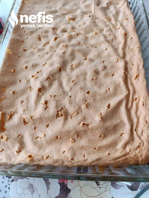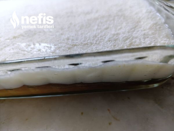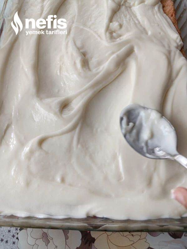 - Kekimiz sütü çektikten sonra muhallebimizi kekin üzerine boşaltalım ve eşit olacak halde düzeltelim.
