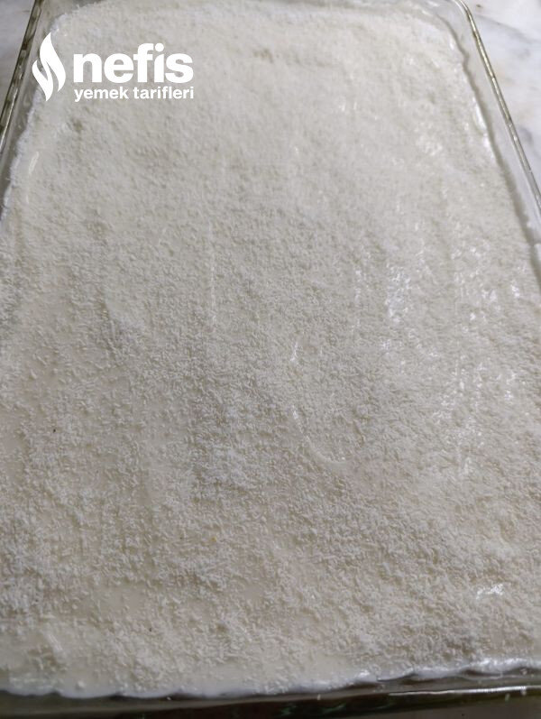 - Son olarak hindistancevizi ile pastanın üzerini kaplayalım ve servis etmeden evvel 2-3 saat kadar buzdolabında dinlenmeye bırakalım. Afiyet olsun ✨🤗.