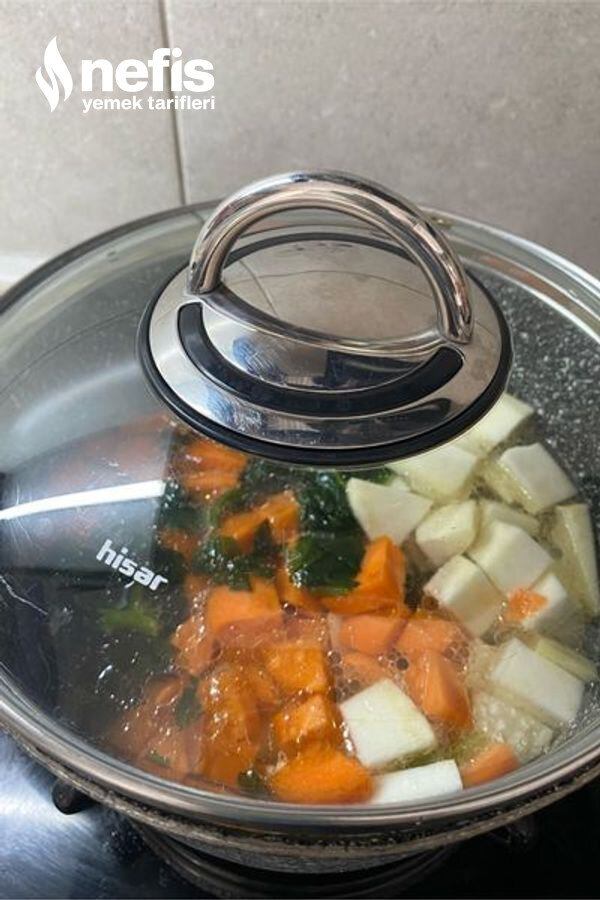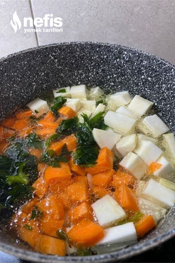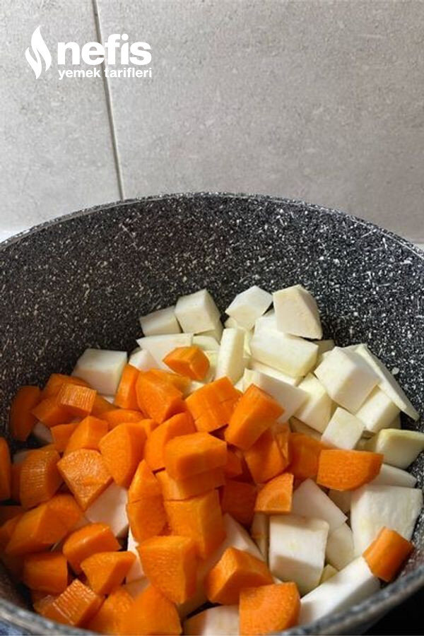 - Havuçlarımızı küp küp doğruyoruz ,bütün gereçleri bir tencerenin içine koyup rastgele bir kavurma yahut pişirme süreci yapmadan üzerine 3 su bardağı soğuk su koyup kapağını kapatıp kısık ateşte yumuşayana kadar pişiriyoruz.