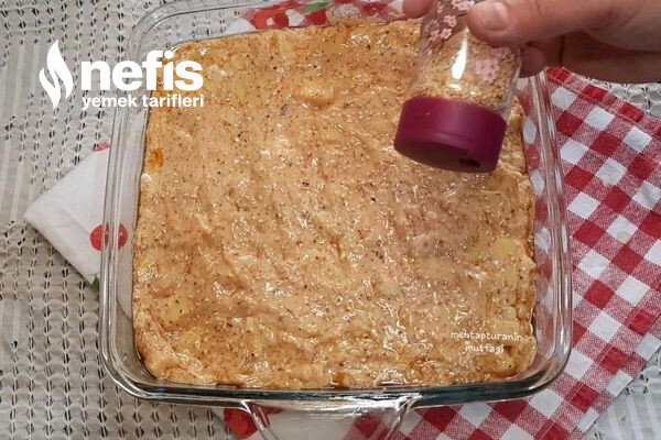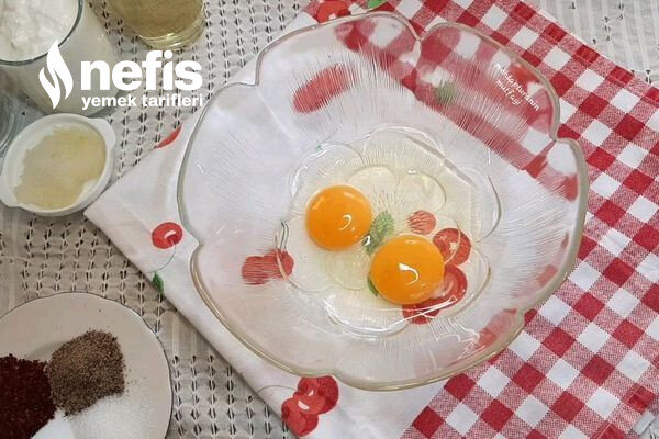 - Sonra karıştırma kabına 2 adet yumurta, tuzu alıp güzelce karıştıralım ,üzerine sıvı yağ ,yoğurt ,soğan, baharatı, patatesi son olarak un ve kabartma tozunu ekleyip karıştırdıktan sonra yağlanmış kare bir cam kaba dökelim.