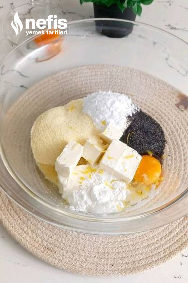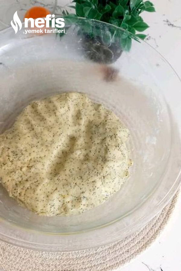 - Üzerine sıvı yağ, yumurta, irmik, pudra şekeri, mavi haşhaş, vanilya, kabartma tozu, limon kabuğu rendesi ve unu ekleyerek güzelce yoğuralım. 10 -15 dk kadar üzerini streçle kapatım buzdolabında dinlendirelim.