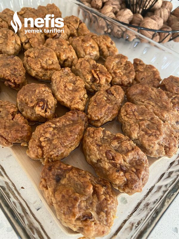 - Hamurumuzu yorğurduktan sonra en son cevizimizi ek edelim tekrar yoğuralım. Hamurdan görüntüde gördüğünüz üzere bir kesim alıp elimizde yuvarlayalım ve üç parmağımız ile ortasına basalım ve tepsimize alalım.
