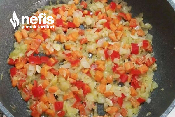 - İçine doğradığımız soğan, sarımsak, küçük küp küp doğranmış havuç ve kırmızı biberi sırasıyla ekleyerek kavuralım.