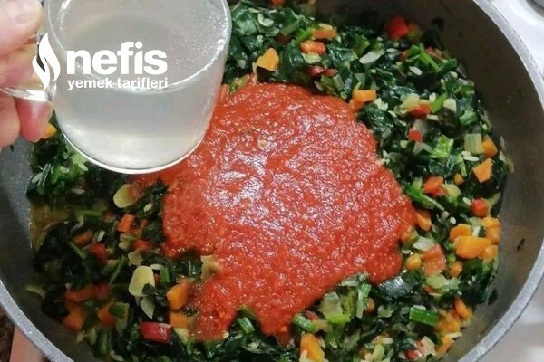 - Ispanaklar sündüğünde domates sosu ve tavuk suyunu ek edelim.