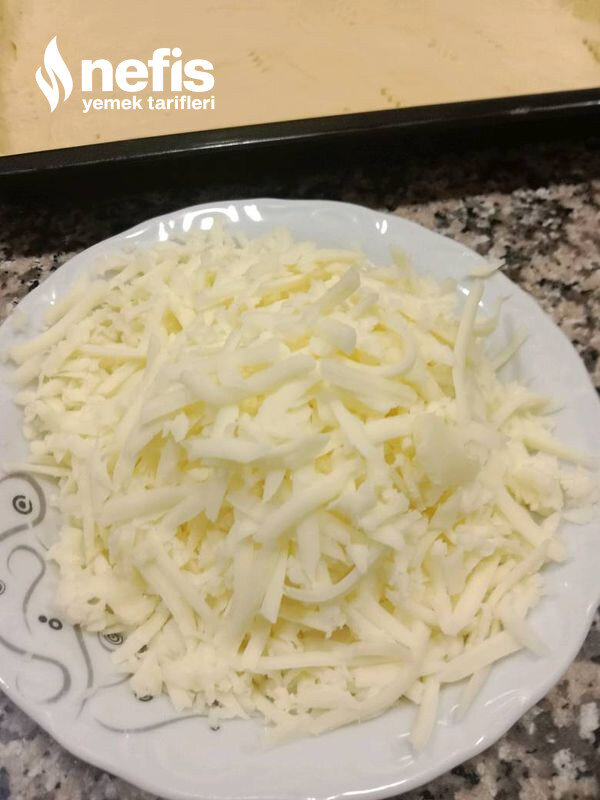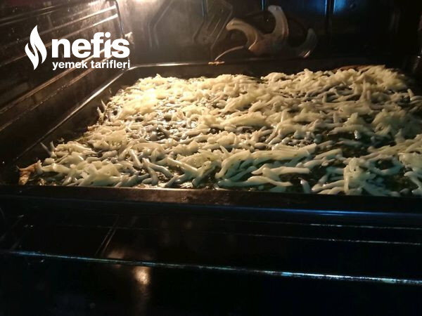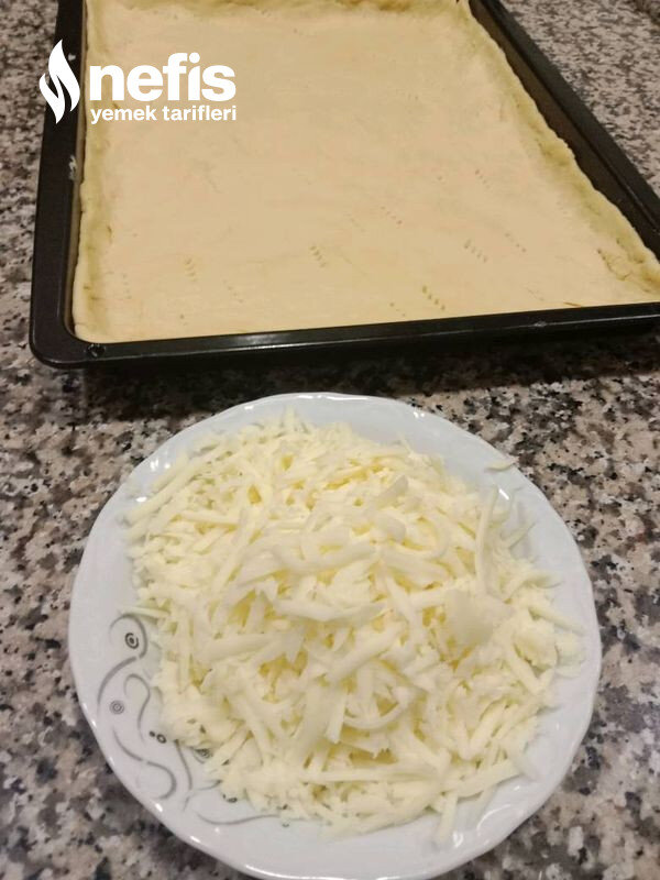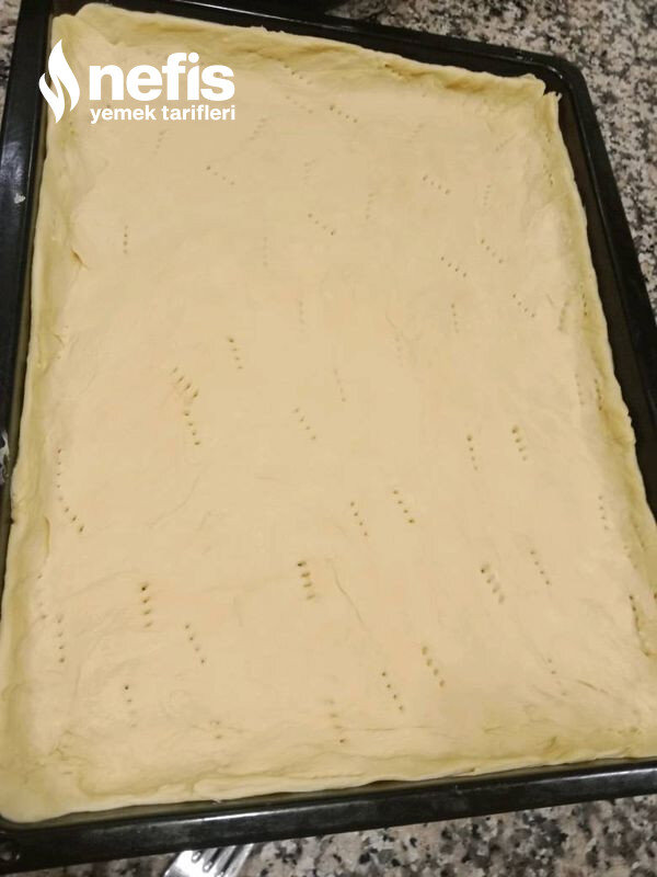 - Tepsi hafif yağlayın, hamur ince tepsi büyüklü de aç tepsiye koyun.