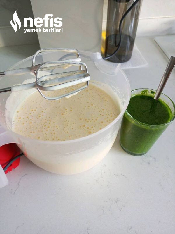 - Süt ılık su ve ıspanak püresini ek edip tekrar çırpalım.