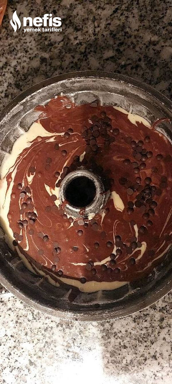 - Kakaolu hamurumuzuda kalıbımıza döküp kaşık yardımıyla biraz karıştırıyoruz üzerine damla çikolatamızı serpiyoruz.