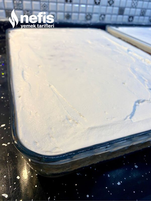 - Sütle çırptığımız krem şantiden 2 yemek kaşığı ayırıp kekin üzerine istikrarlı bir biçimde yayın.