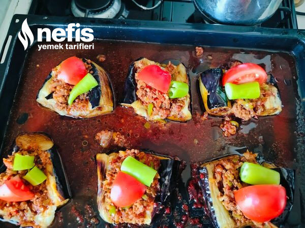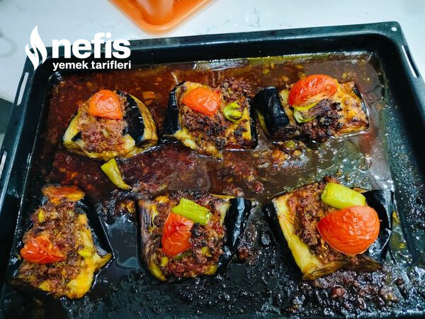 - Piştikten sonra patlıcanlarımızı içini açıp biraz ezip yaptıgımız kıymalı harçları içlerine yerleştiriyor üzerine daha sonra tepsiye diziyoruz, salçalı sos yapıp üzerine döküyoruz.