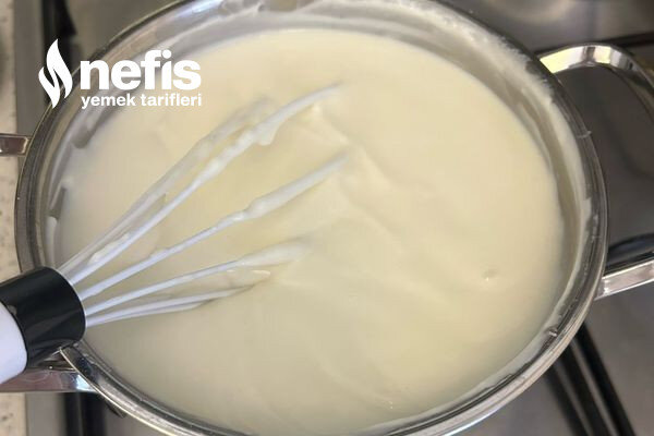 - Muhallebi için tencereye un,süt ve şekeri alıp pişirelim, kaynayınca altını kapatalım.