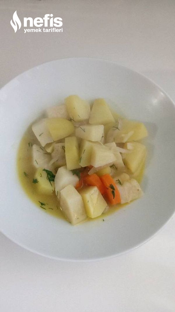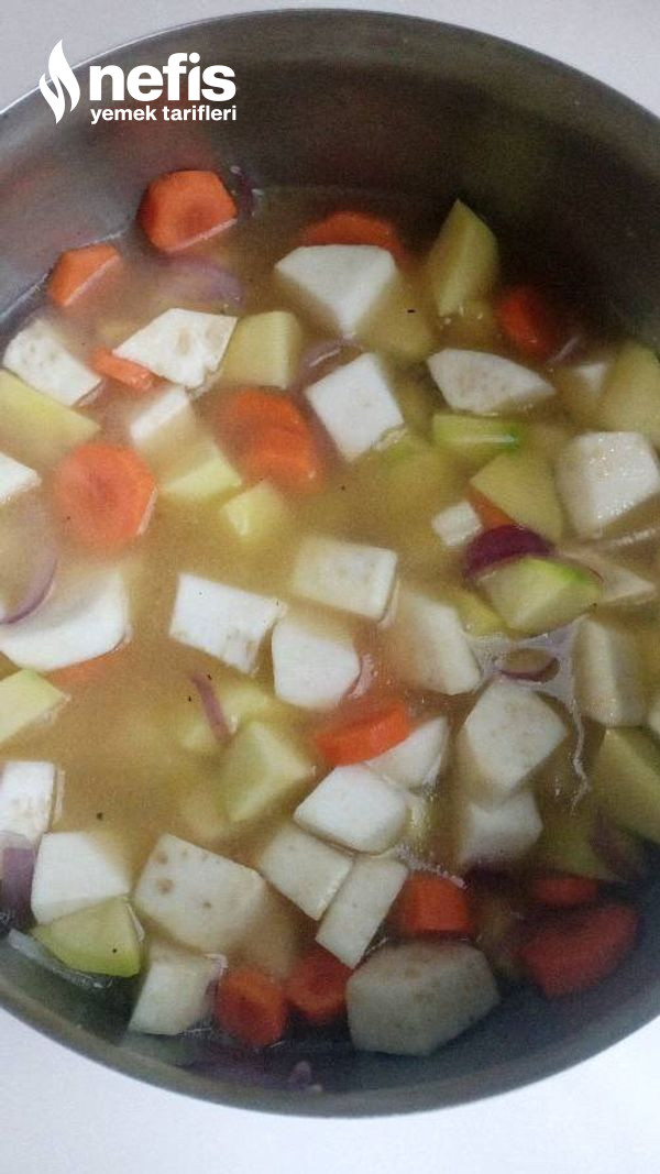 - Üzerine limonlu suda beklettiğimiz kerevizleri durulayıp, soyup küp küp doğradığımız patates ve halka halka olan havuçları ekliyoruz 2-3 dakika burda kavuruyoruz.