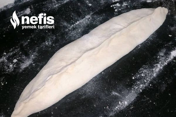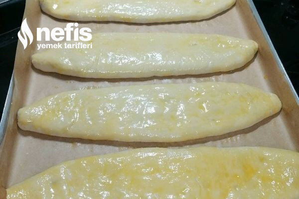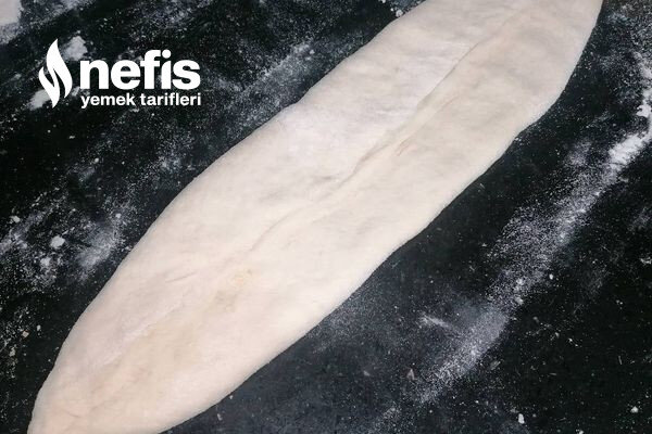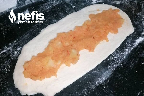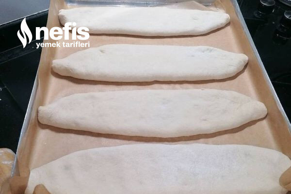 7. Dinlenen hamurumuzu tezgahta biraz yoğurup portakal büyüklüğünde bezelere ayırıyoruz her bezeyi uzunlamasına açıp içine harcımızdan koyup üstten güzelce kapatıp üstüne bastırıp tepsiye diziyoruz.