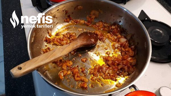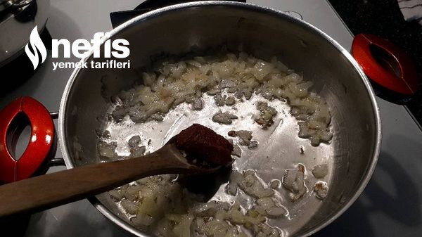 - 1 yemek kaşığı domates salçasını ve karabiberi katarak salçanın kokusu cıkana kadar 1-2 dakika kadar kısık ateşte kavurun.