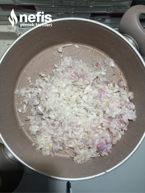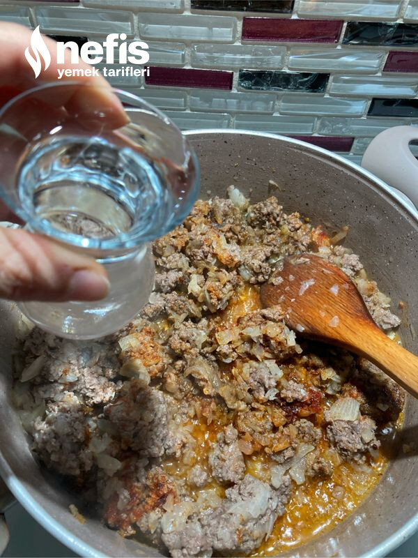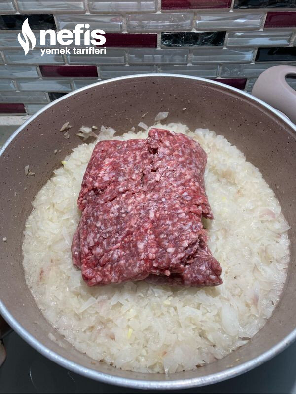 - İç harcı için soğanları küp küp doğrayıp, 4 kaşık yağda beş dakika kadar çevirelim sonrasında kıymamızı ekleyelim. Baharatları ve suyu ekleyip 10 dakika kadar suyu çekene kadar pişirelim. Ve kıyma harcımızı soğuması için kenara alalım.