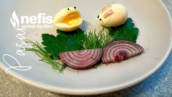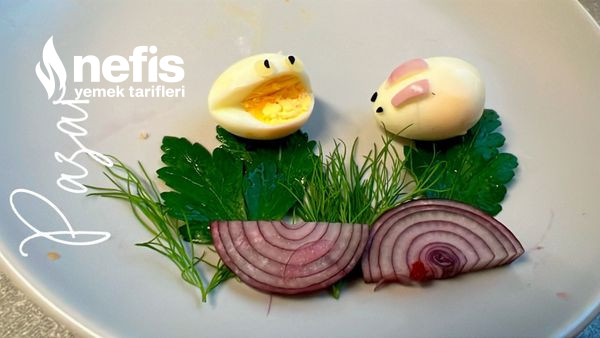 - Yumurtalar haşlanır. Soyulur bir yumurtadan uzunluktan boya bir dilim kesilir.