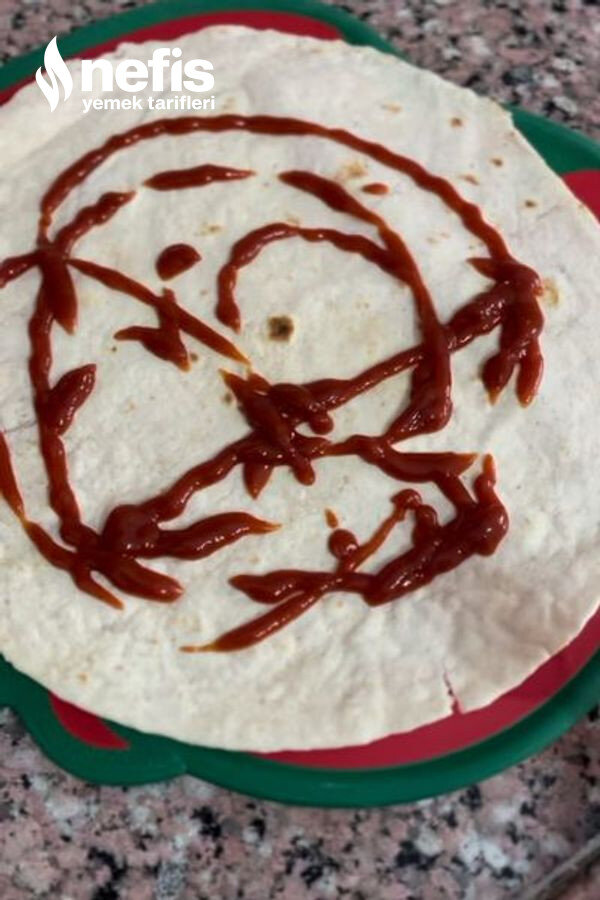 - Ardından lavaşımızı tezgaha alalım, üzerine kahvaltılık sosumuzdan yahut ketçaptan bıçak yardımı ile sürelim. Şayet kahvaltılık sos kullanmak istemezseniz domates yahut biber salçası da kullanabilirsiniz.
