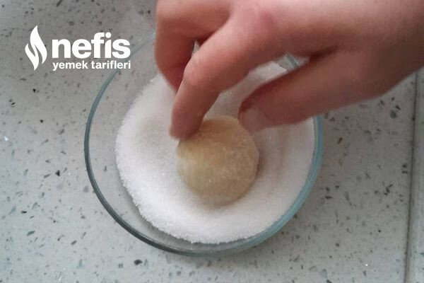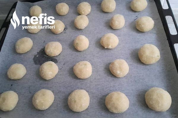 - Hamurdan ceviz büyüklüğünde kesimler koparıp yuvarlayalım toz şekere batırıp yağlı kağıt serilmiş fırın tepsisine dizelim.