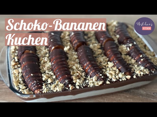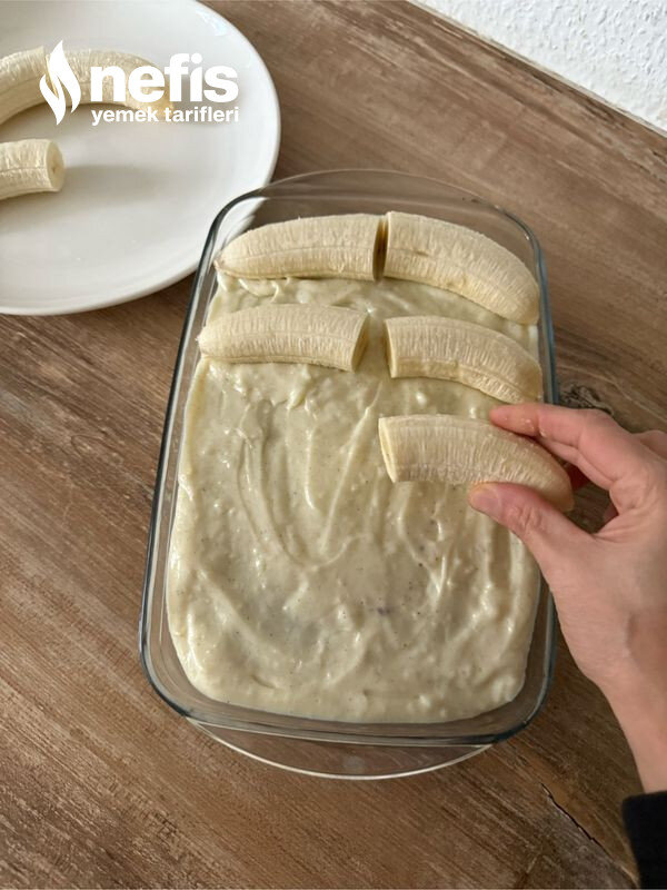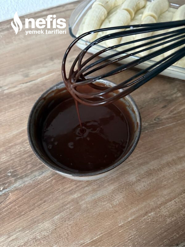 - Muzları soyun, ikiye bölün ve yavaşça bastırarak muhallebinin üzerine yerleştirin. Çikolatalı ganajı muzların üzerine dökün. Eritilmiş bitter çikolata ile süsleyin.