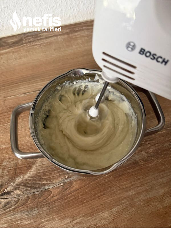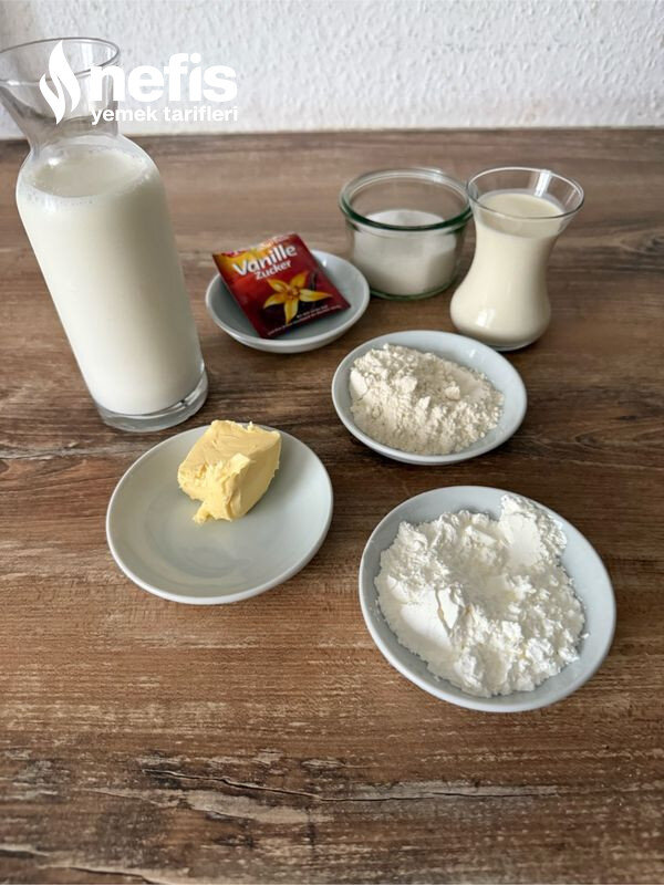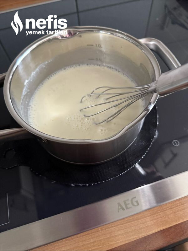 - Muhallebisi için; süt, şeker, un ve mısır ununu daima çırparak kaynatın. Tencereyi ocaktan alın. Tereyağını ve vanilyayı ekleyin ve çırpın. Muhallebinin üzerini streç sinema serin ve ılımaya bırakın.