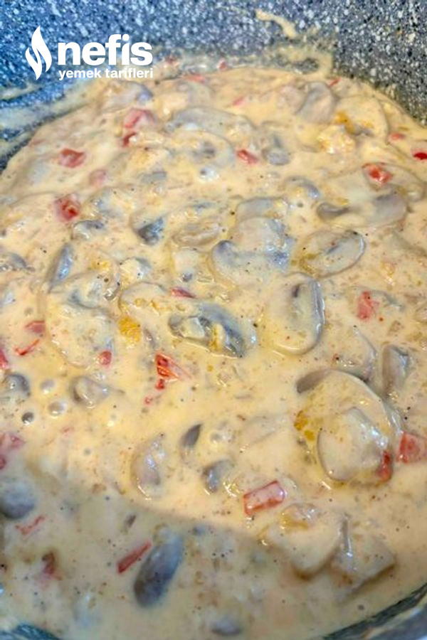 16. Mantar sosu fazla yüksek koymayın devrilebilir ve en üste rendelenmiş kaşar peynirini ekliyoruz paylaştırıyoruz.