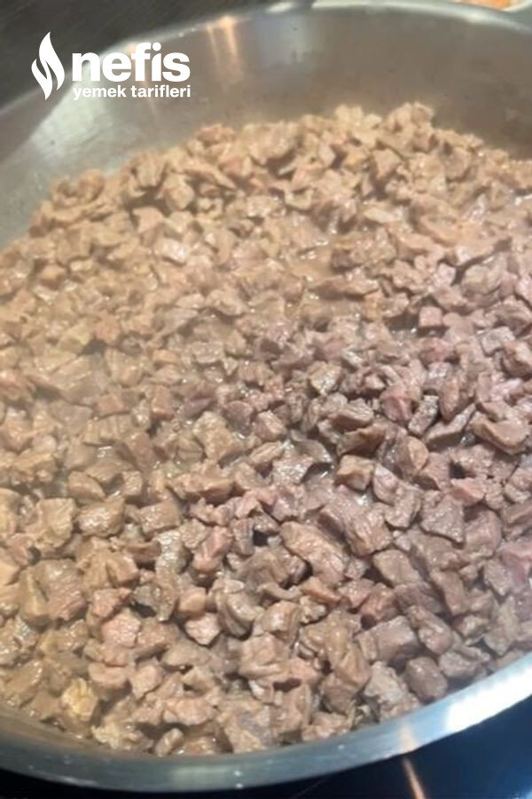 - Tavaya çok küçük kesilmiş etleri alıp kapağını kapatıp etler sulanıp suyunu çekene kadar pişirelim.Arada bir karıştıralım.