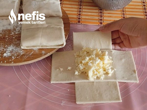 - Tezgaha hafif un serpelim biçim verdiğimiz milföy hamurunu merdane yardımıyla açalım büyük bir kare hali verelim.