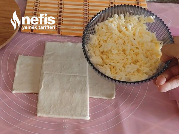 - Öncelikle milföy hamurunu çıkarıp yumuşamaya bırakalım iki adet uzun milföy hamurunu ( 4 kesim olacak ).