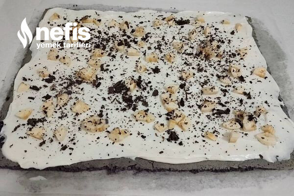 - Pandispanyanın üst kısmına kremamızı sürelim içine muz ve çikolata kesimleri ekleyelim.