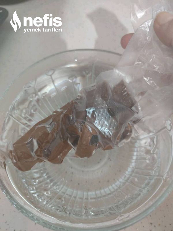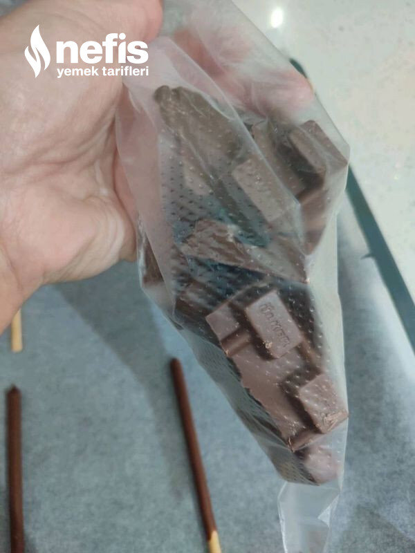 - Çikolataları kırıp krema torbasının içine koyalım ve kaynamış su dolu kasede benmari metodu eritelim.